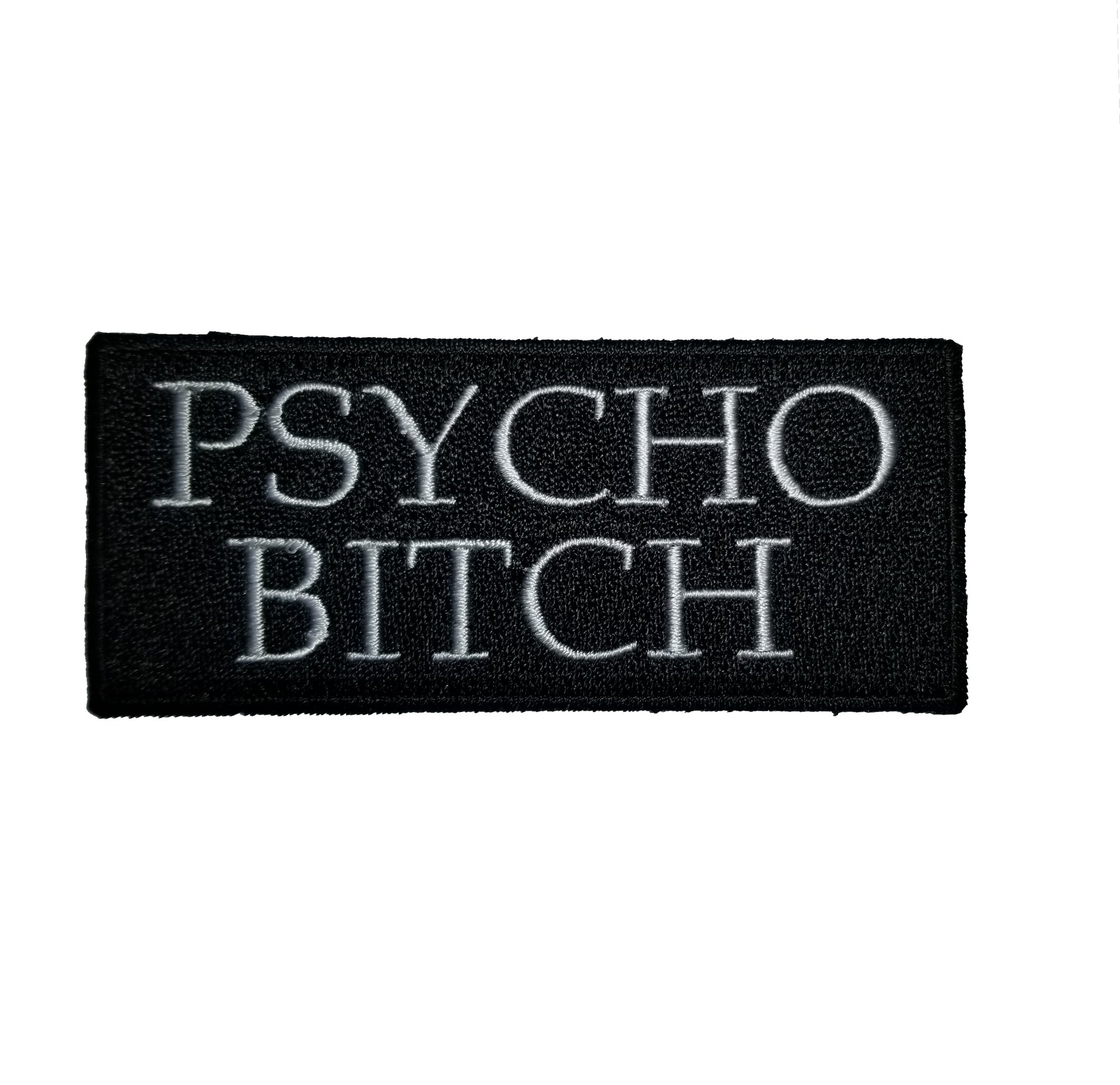 Embroidered patch, black with "PSYCHO BITCH" in white and black border. Iron on backing. Patch size is approximately 3-3/8" x 1-1/2."